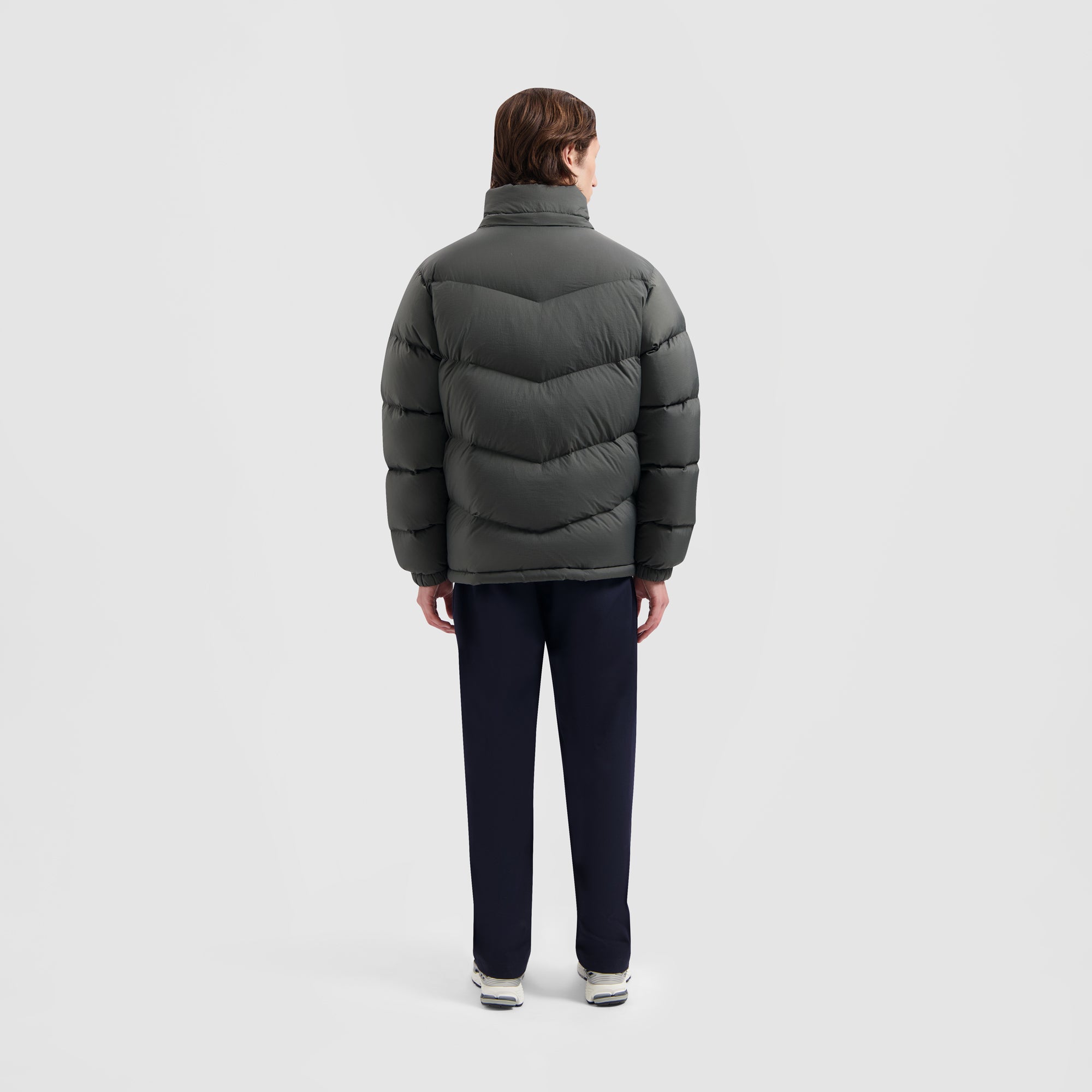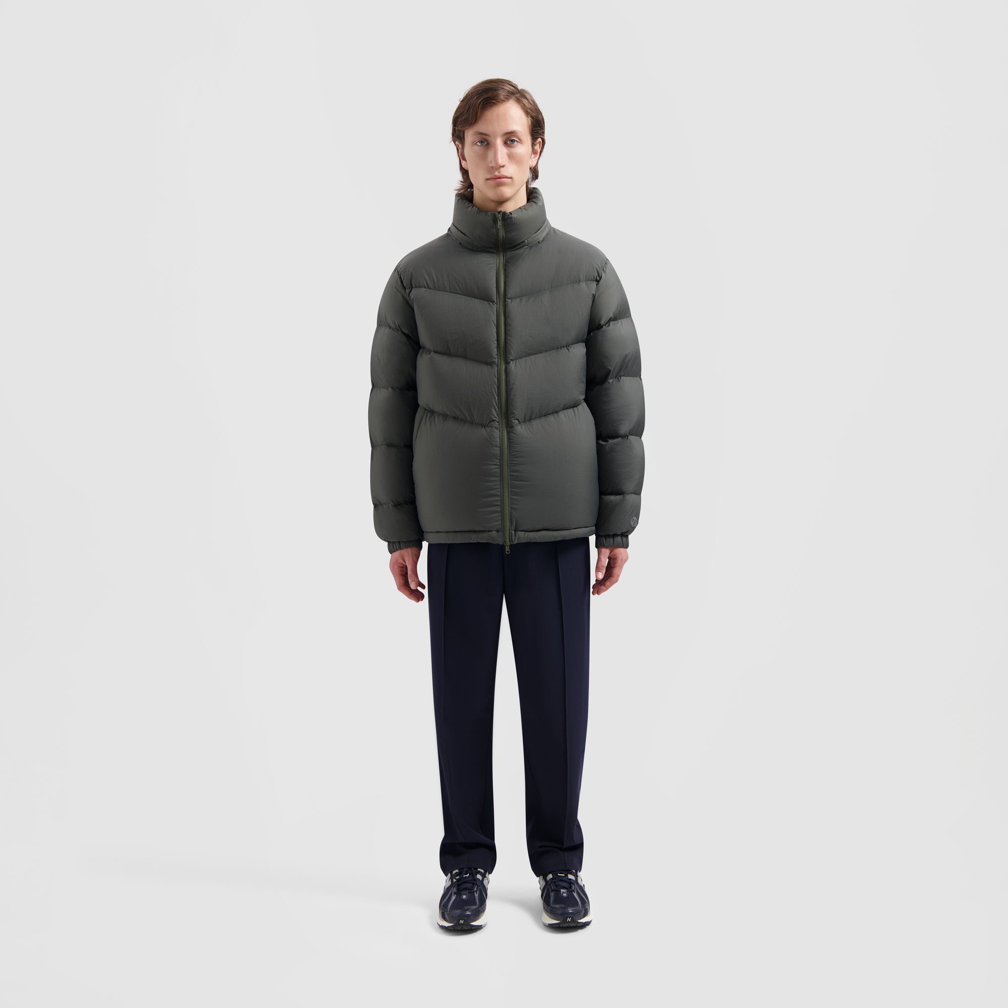The OLAF Chevron Puffer in Olive Green has arrived, ensuring you don't have to compromise on style and versatility. This 100% down-filled jacket showcases a detachable hood and a tonal OLAF logo on the wearer’s left arm. Its side zip pockets keep your hands cozy and your essentials secure. The jacket is crafted from water-resistant fabric but is not fully waterproof.