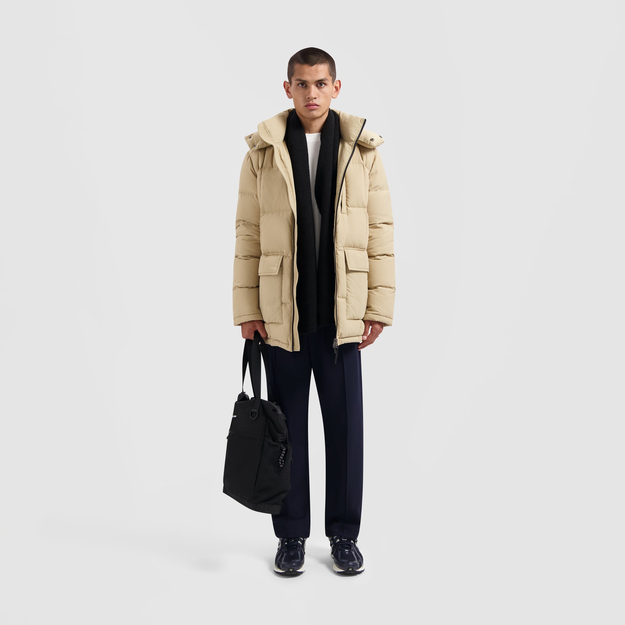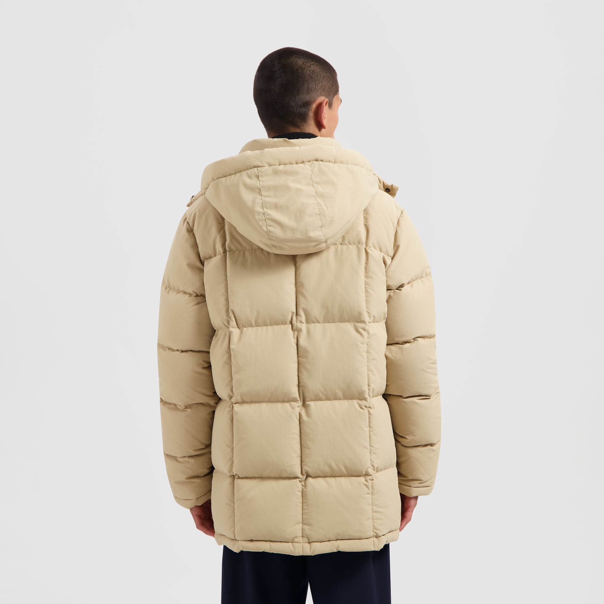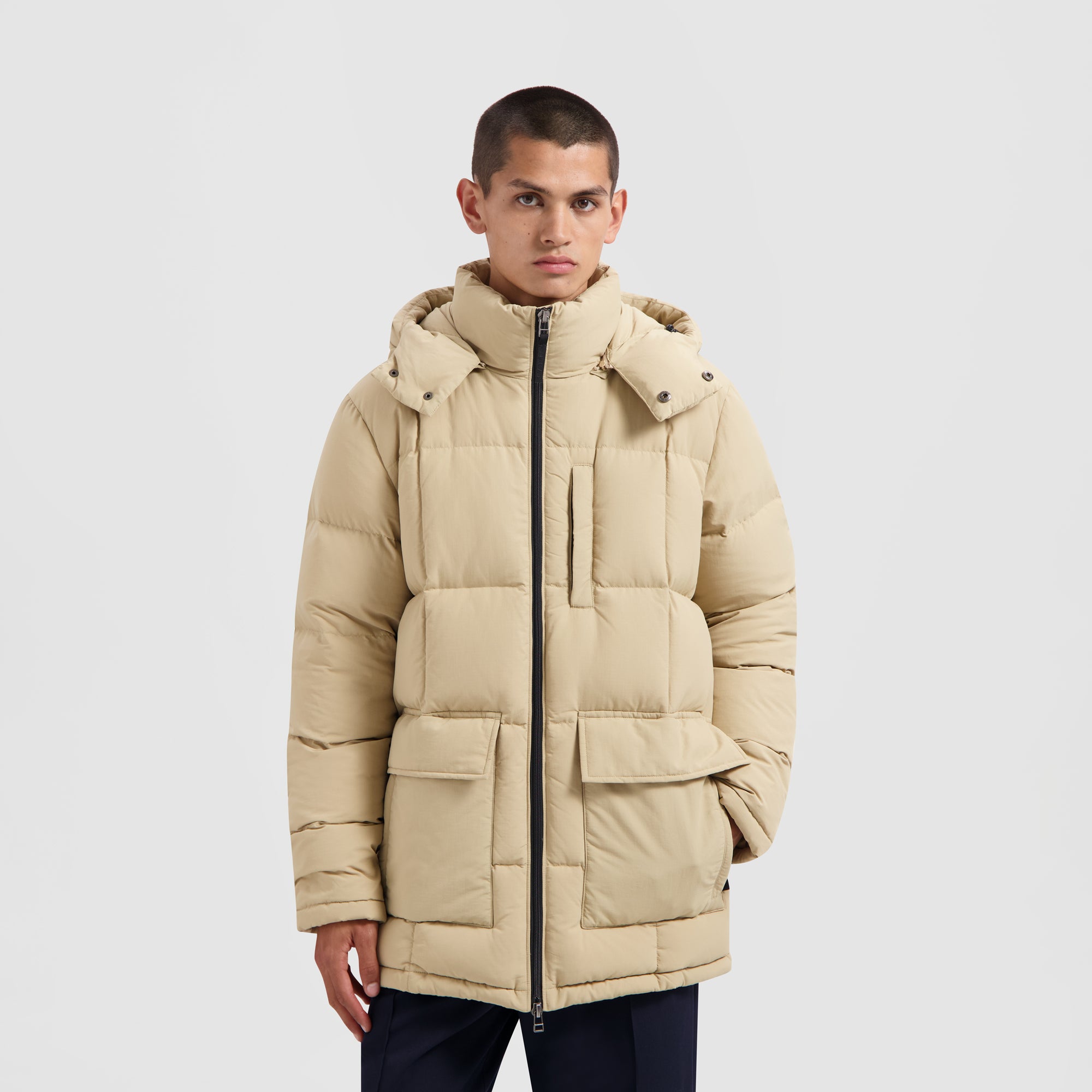 Elevate your comfort and warmth with the OLAF Beige Midlong Puffer. Its front boasts dual pockets with zip and button closures, including two compartments, along with an extra chest pocket for your essentials. Filled with feather down and crafted from water-resistant fabric (though not fully waterproof), the jacket offers both insulation and style. Customize your appearance with the detachable hood.