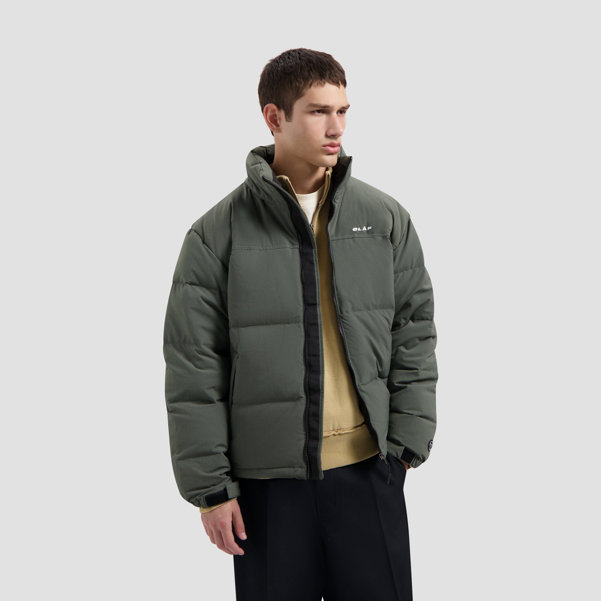 As a true winter staple, the OLAF Puffer Jacket is back so you don't have to compromise when it comes to style and comfort. This 100% down-filled jacket comes in Dark Green and features the OLAF logo on the chest and a built-in packable hood, while its side zip pockets keep your hands warm and your essentials safe. The jacket is made from water-resistant fabric but is not waterproof.