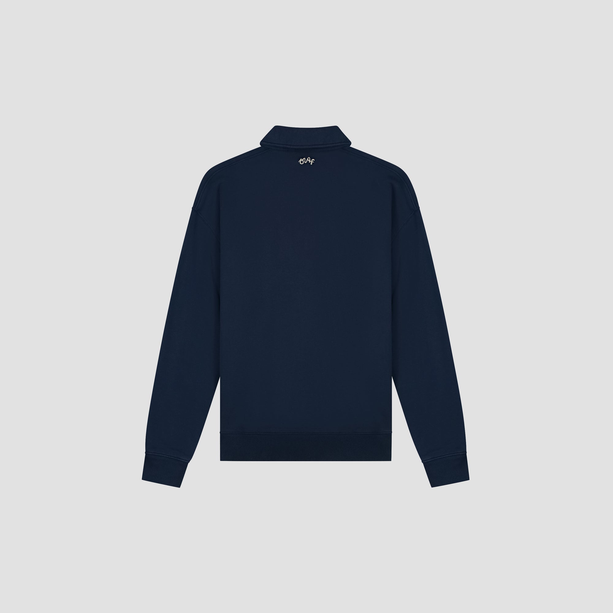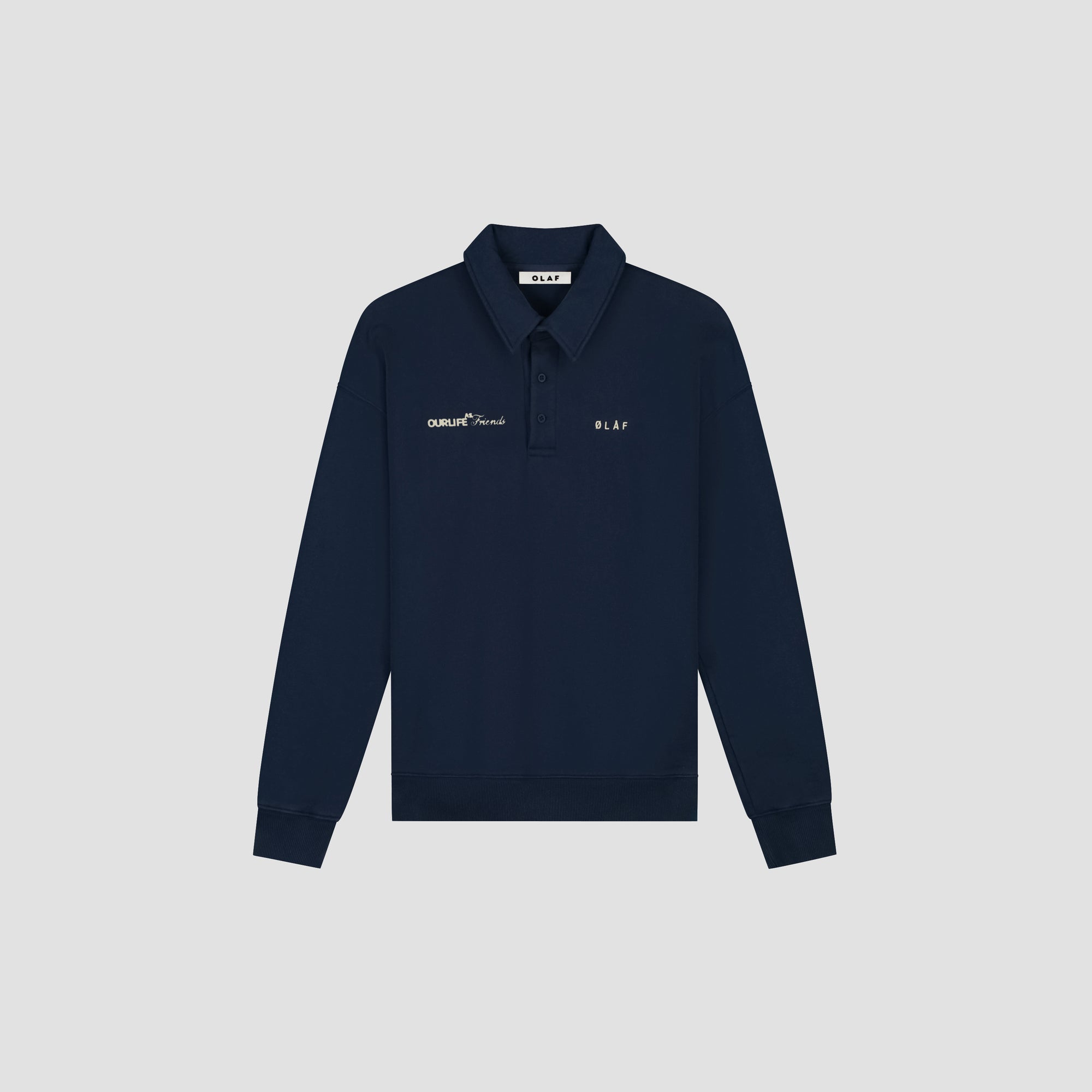 The Script Friends Oversized Polo in Navy features a soft organic cotton fleece with embroidered Script Friends and OLAF branding at the chest. Designed with an oversized fit and ribbed trims for a relaxed everyday feel.