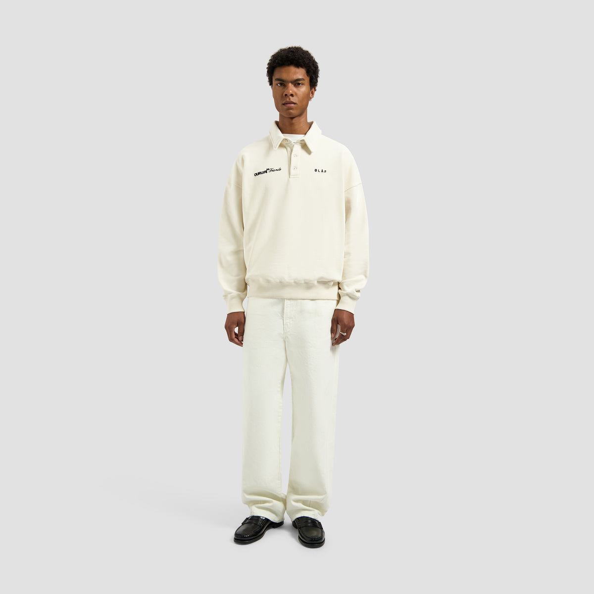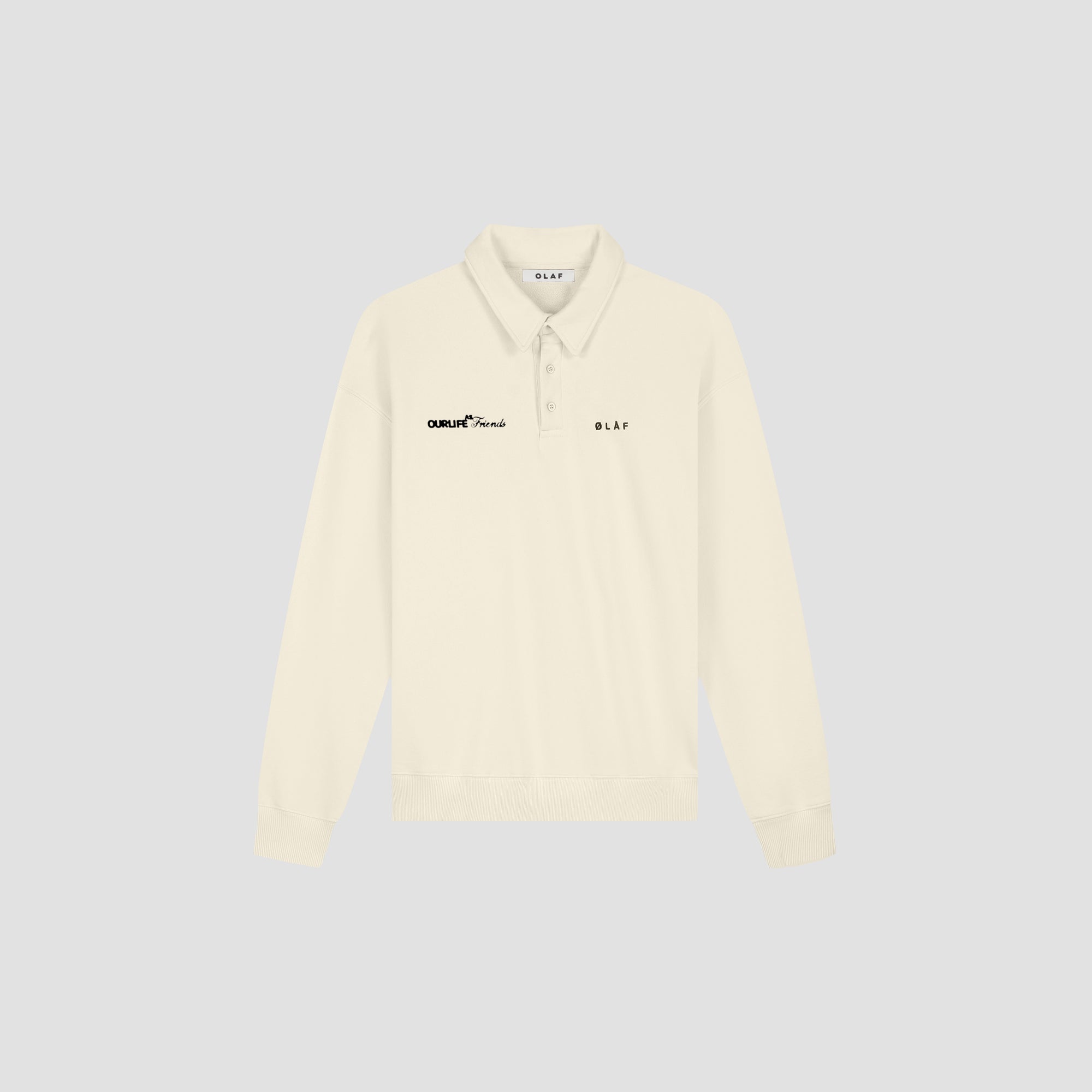 The Script Friends Oversized Polo in Off-White features a soft organic cotton fleece with embroidered Script Friends and OLAF branding at the chest. Designed with an oversized fit and ribbed trims for a relaxed everyday feel.