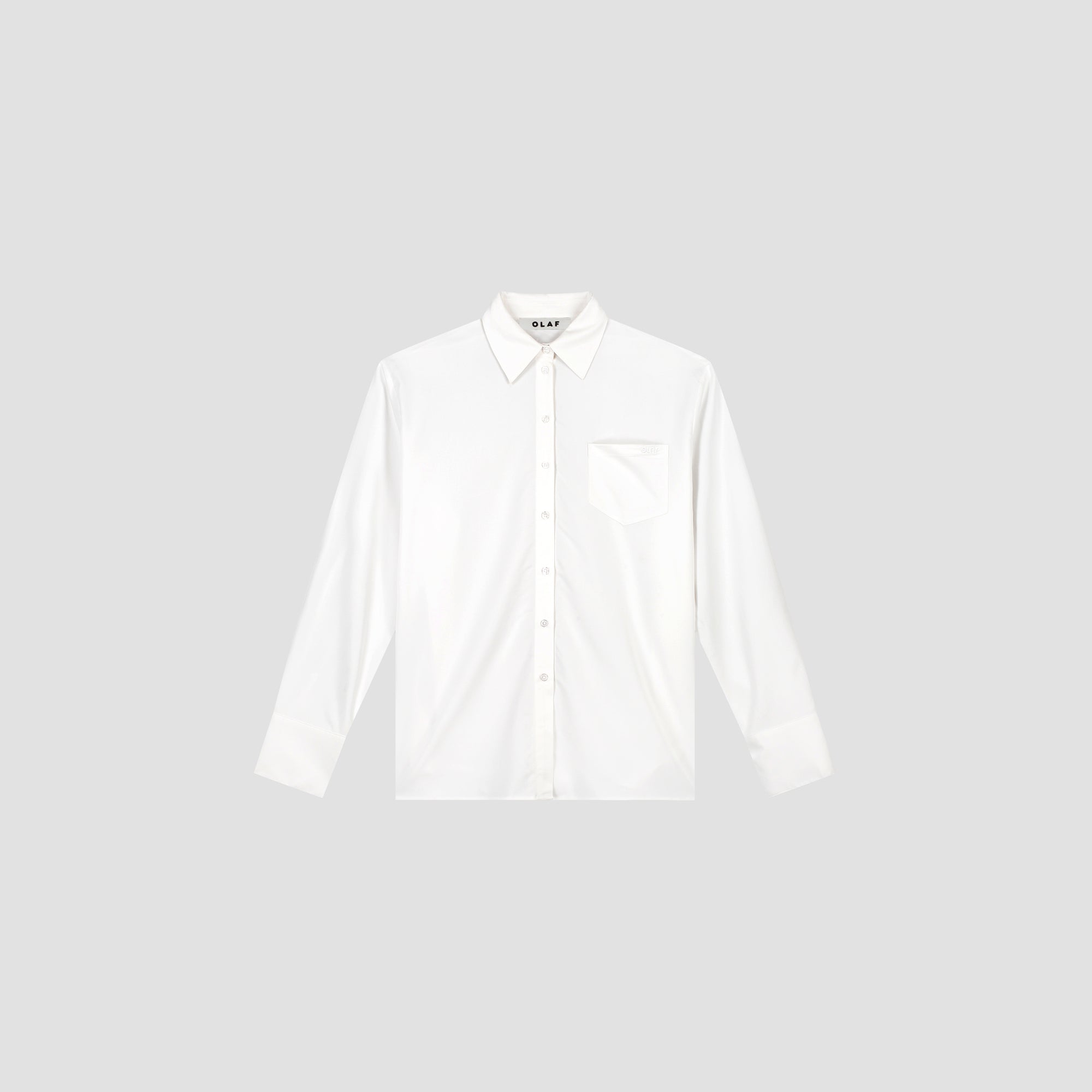 The Drapey Asymmetric Shirt in Optical White features a fluid, lightweight fabrication with an asymmetric design detail. Updated in a new seasonal color, it offers a relaxed, elegant silhouette that transitions effortlessly from day to evening.