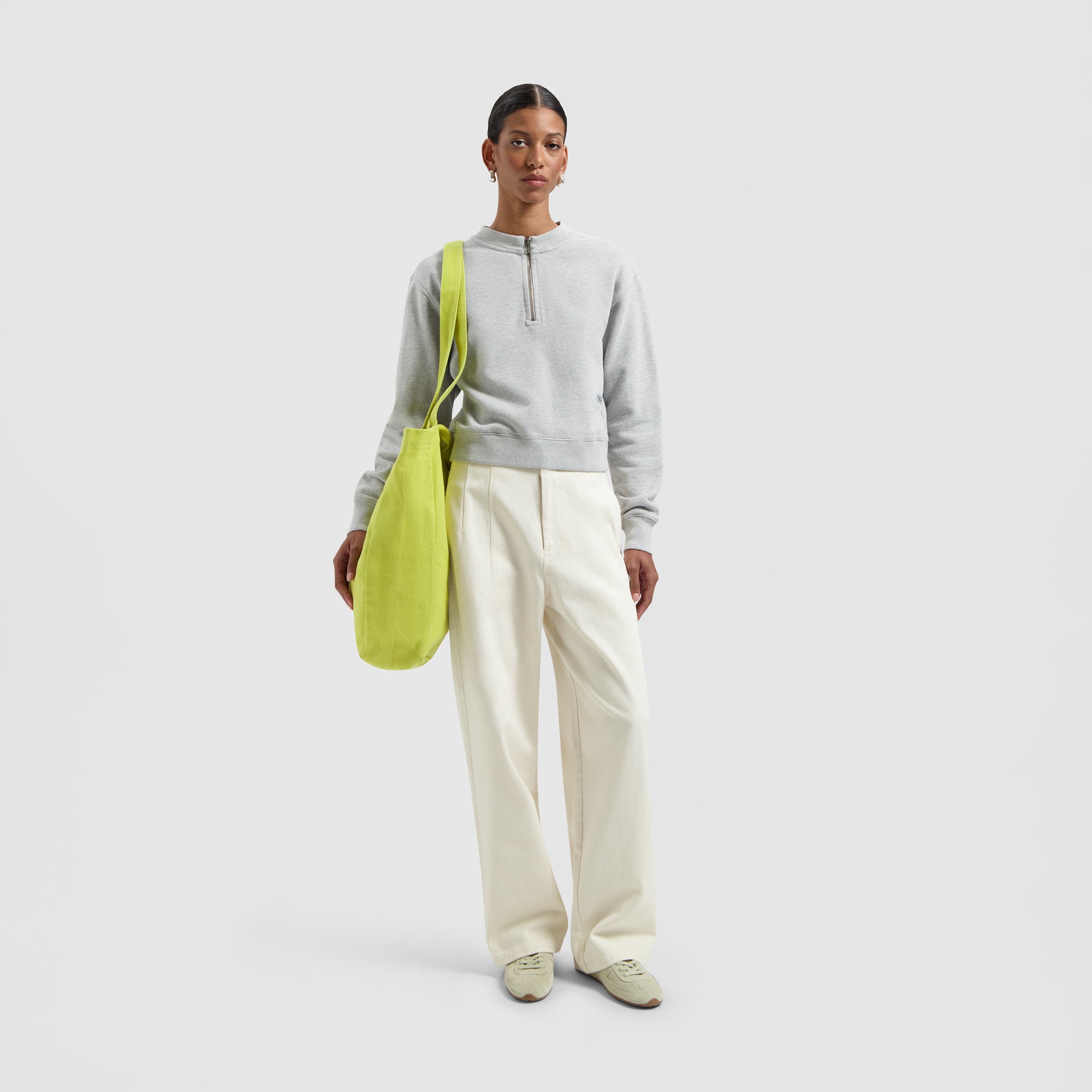 The Retro Logo Zip Mock Neck in Heather Grey combines vintage-inspired style with modern functionality, featuring a zip closure for adjustable comfort. Crafted from organic cotton, this top is perfect for layering and adds a stylish touch to your everyday outfits.