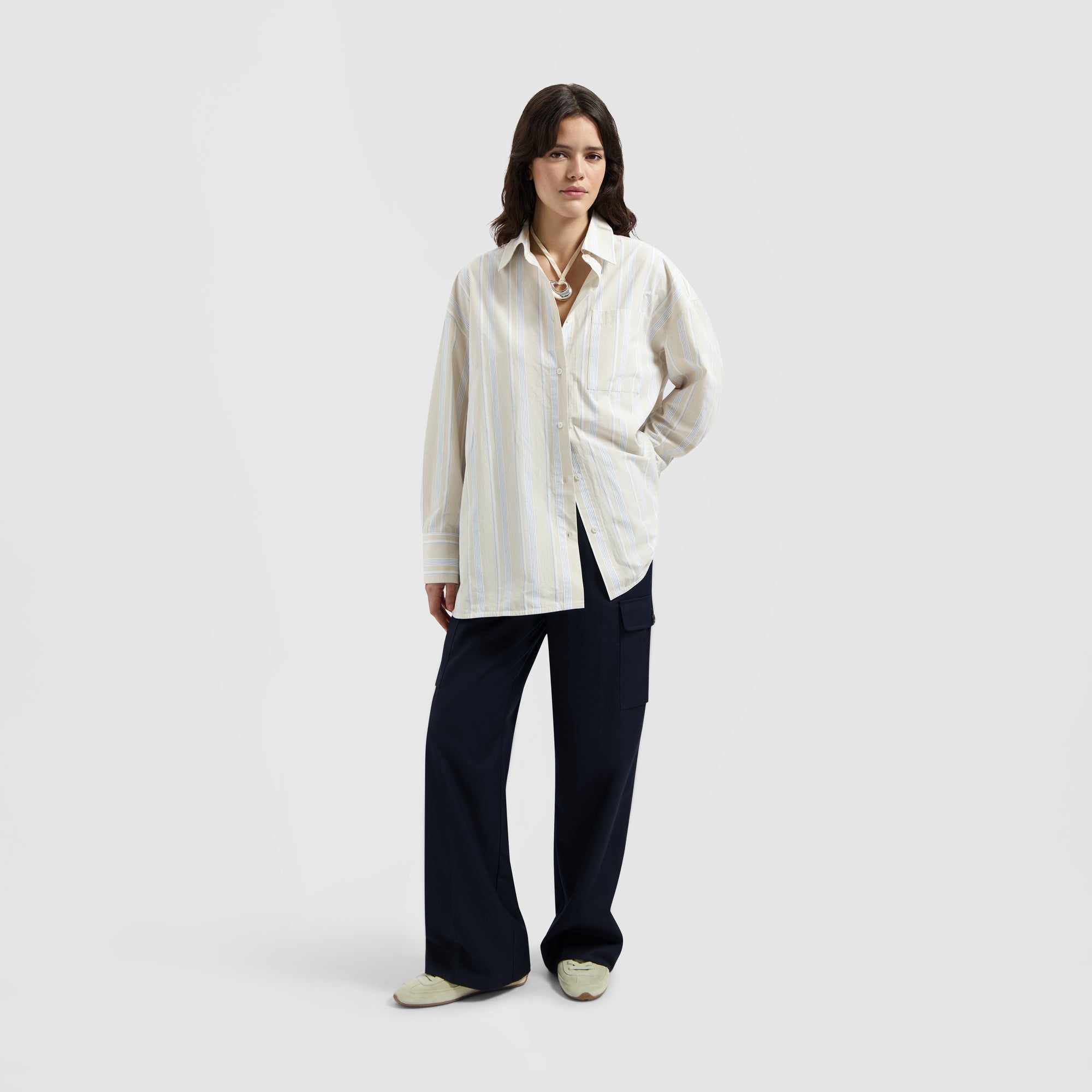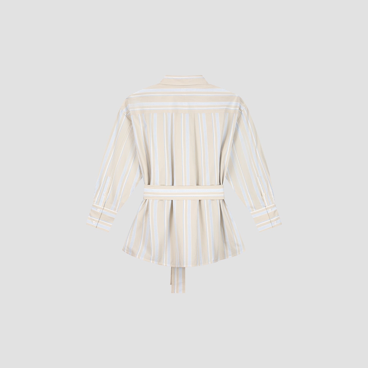 The Stripe Tie Shirt LS in Blue features a playful striped pattern with a stylish tie detail at the waist, adding a fun twist to a classic silhouette. Crafted from lightweight fabric, this long-sleeve shirt is perfect for effortlessly elevating your casual looks or dressing up for a night out.