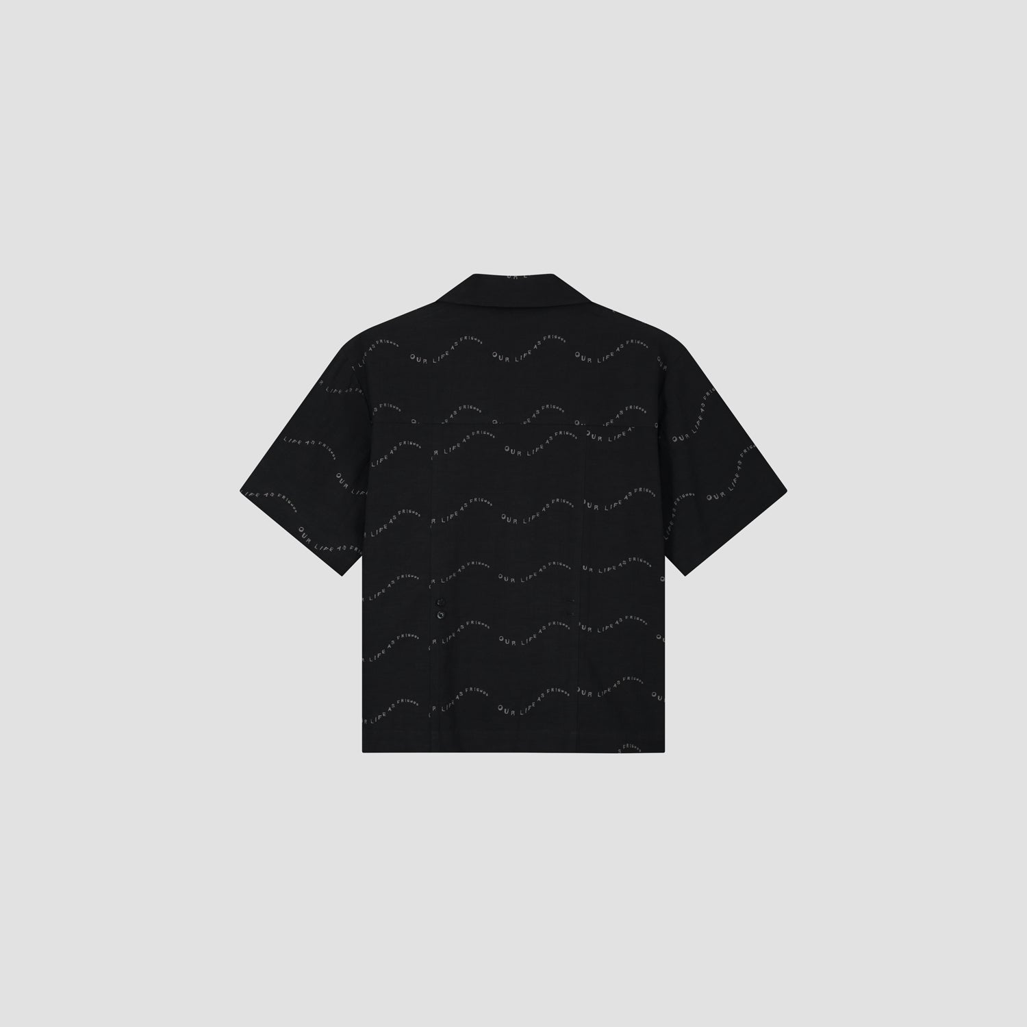 The ØLÅF WMN Open Collar Shirt SS in Black is a ready-to-wear piece with an all-over seasonal logo print inspired by the waves of the ocean. The shirt is designed with a boxy fit, a button-front closure, a camp collar, and dropped shoulders. On the back, an adjustable buttonhole is added for you to have the option to make the shirt slimmer for a more elegant look.