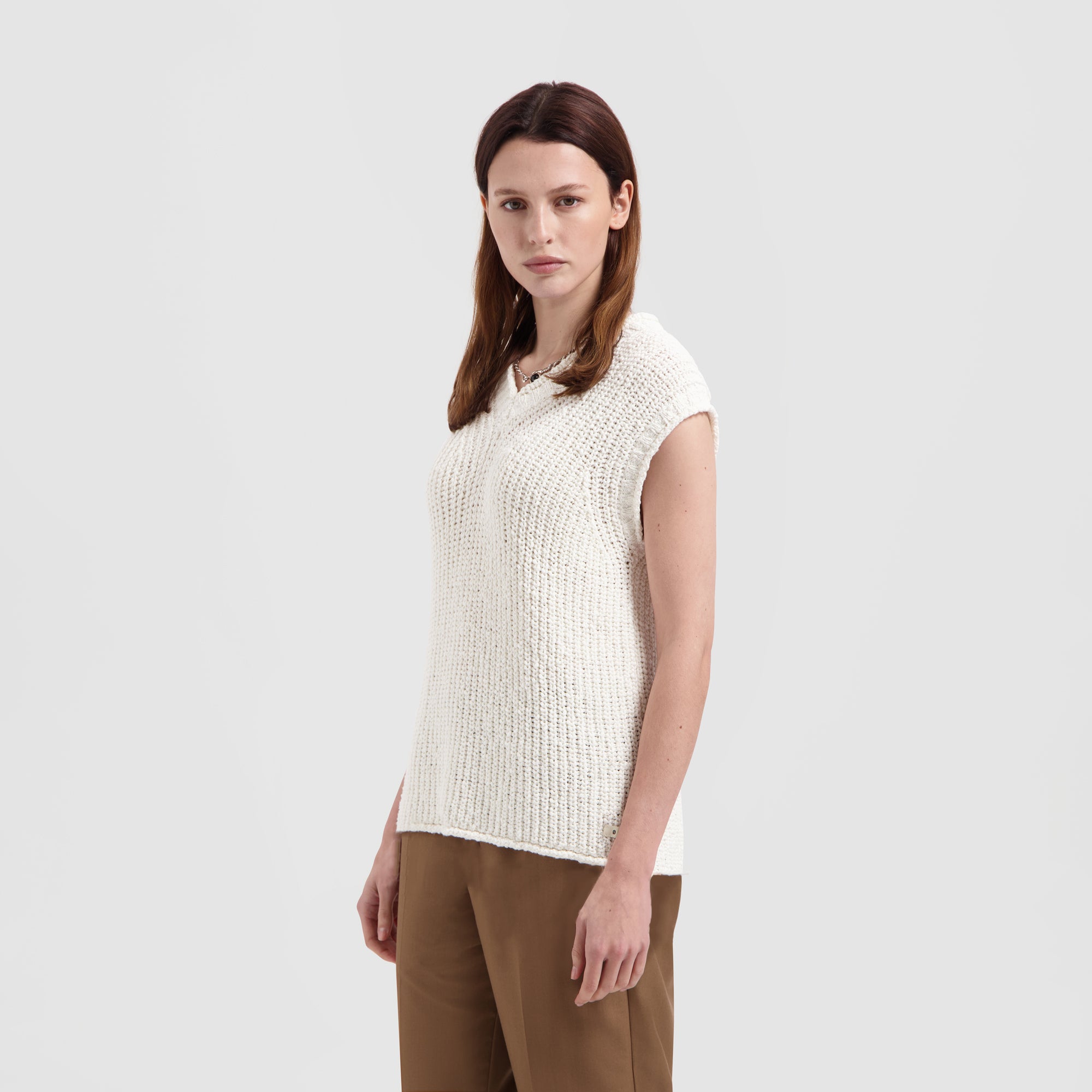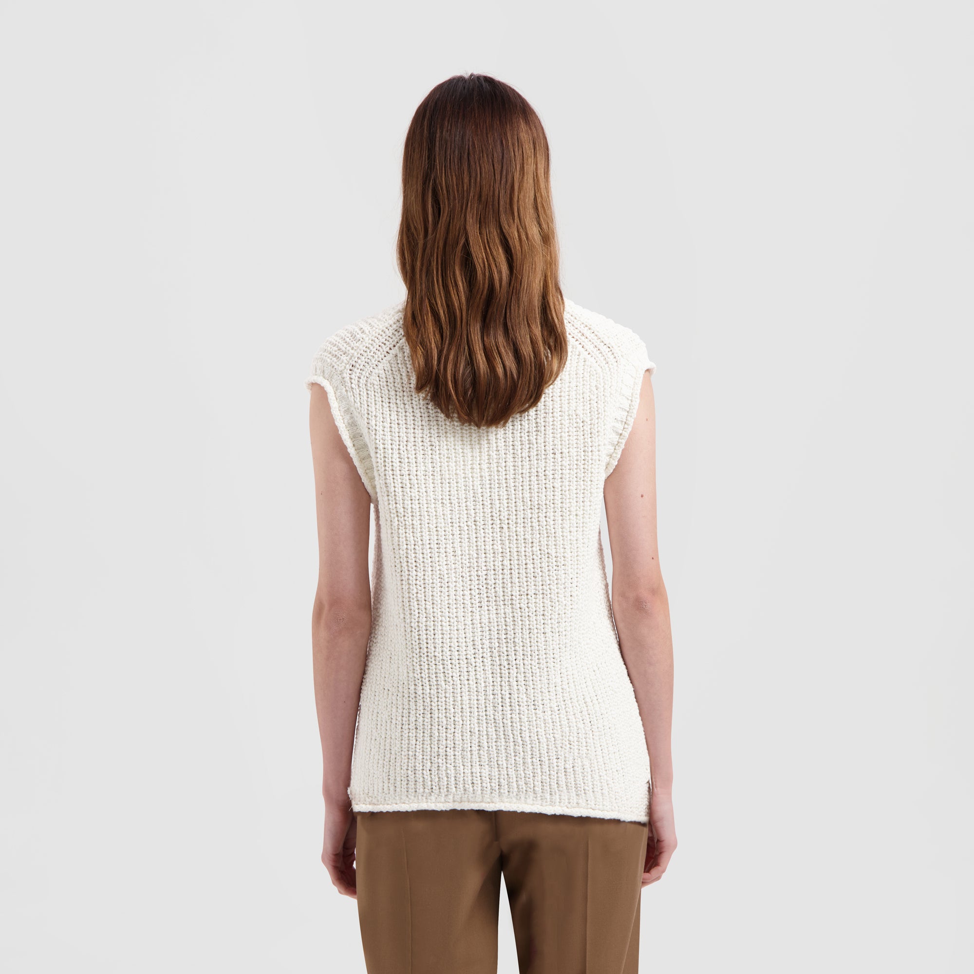 The knitted and airy ØLÅF WMN Slub Vest in Off White offers the versatility to style it in an array of different ways. Based on the classic vest silhouette with an open V-neck and a textured pattern, this piece can be worn as a layering option or on its own on warmer days.