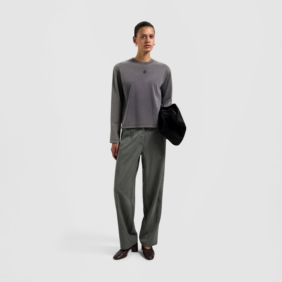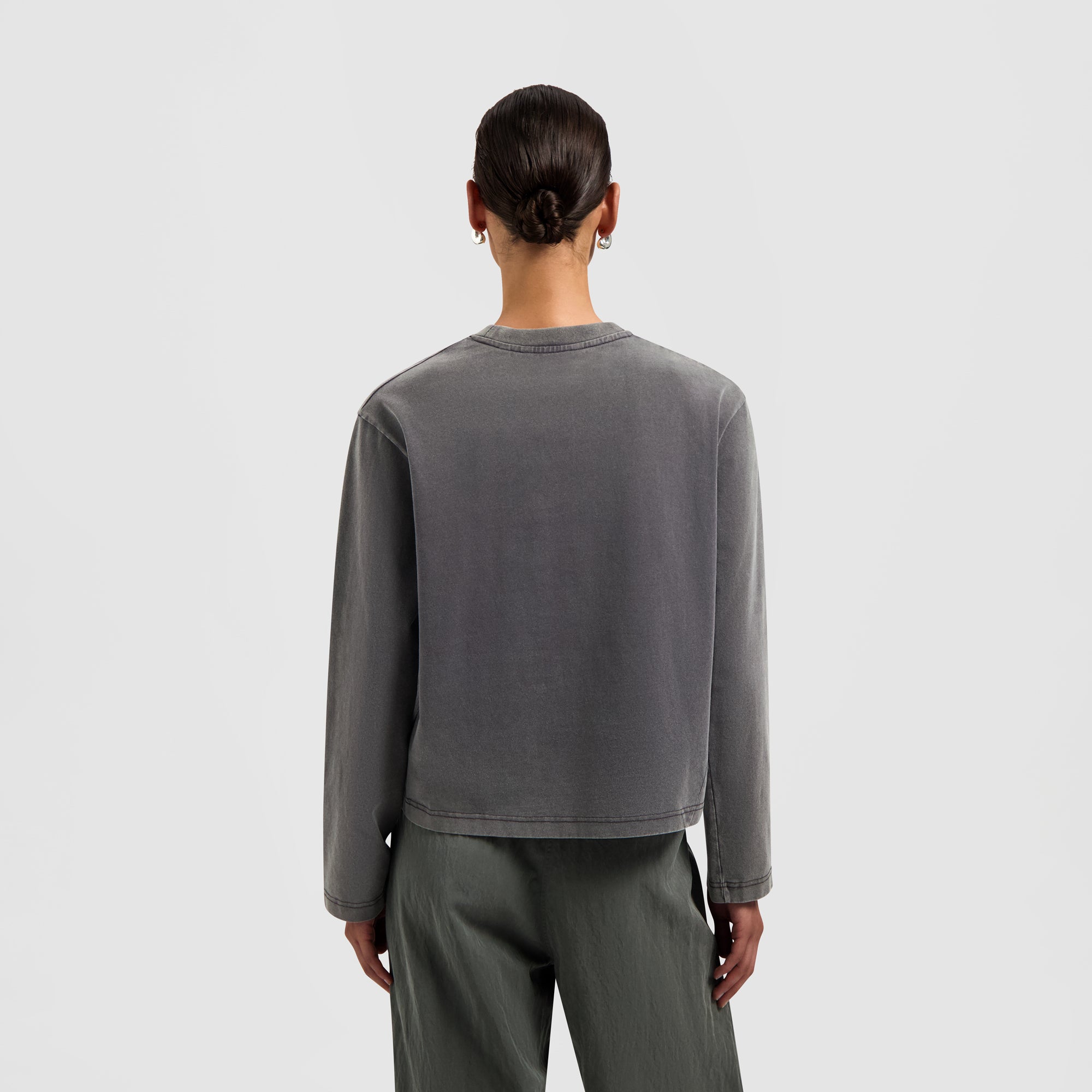 The Monogram Washed Tee in Charcoal features a soft washed finish with a subtle monogram logo on the chest. Designed for everyday ease, it offers a relaxed feel with a refined graphic touch.