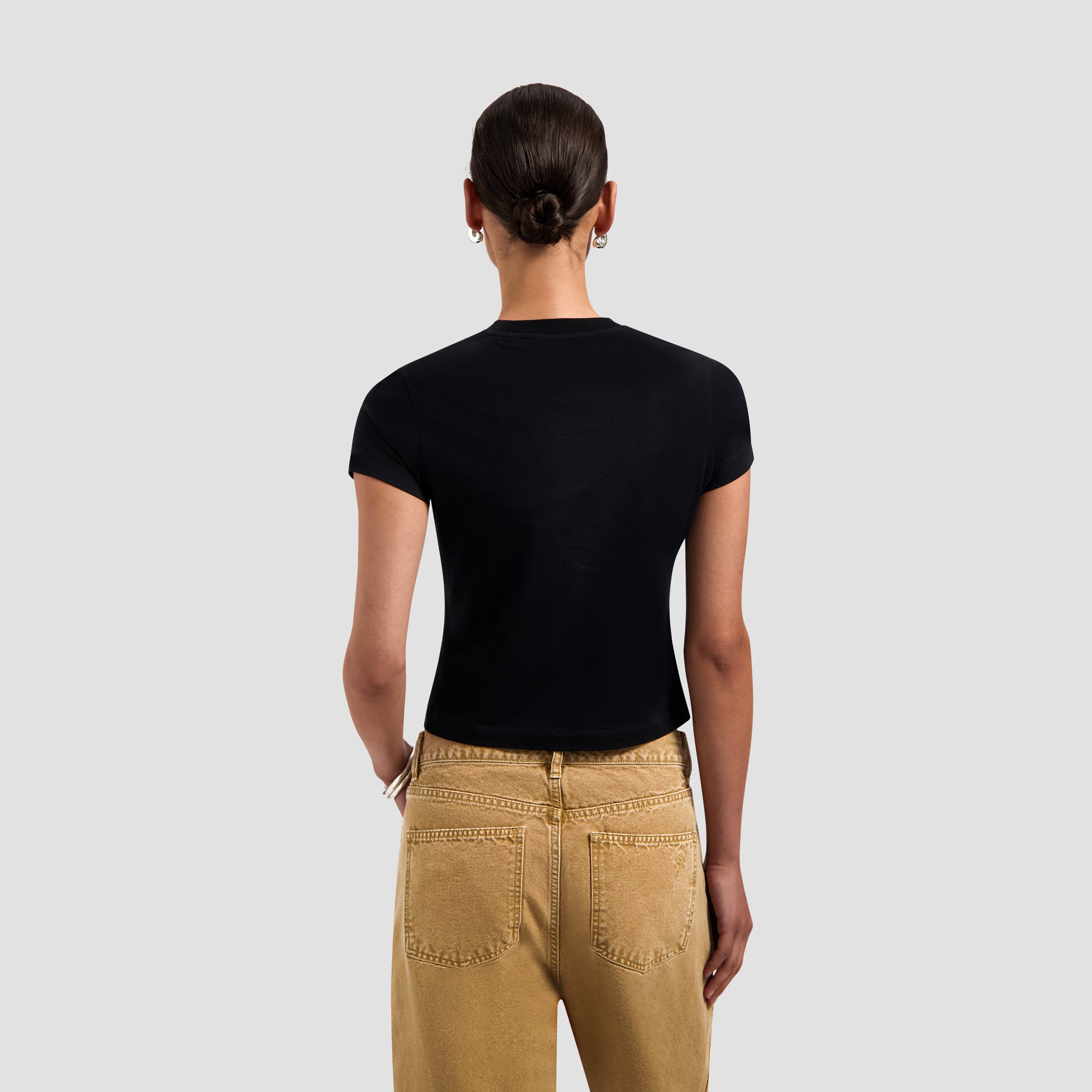 The Olaf Tape Baby Tee in Black reimagines a fitted baby tee with a taped logo on the front. Made from a soft organic cotton blend with a hint of stretch, it offers a clean and contemporary feel for everyday wear.