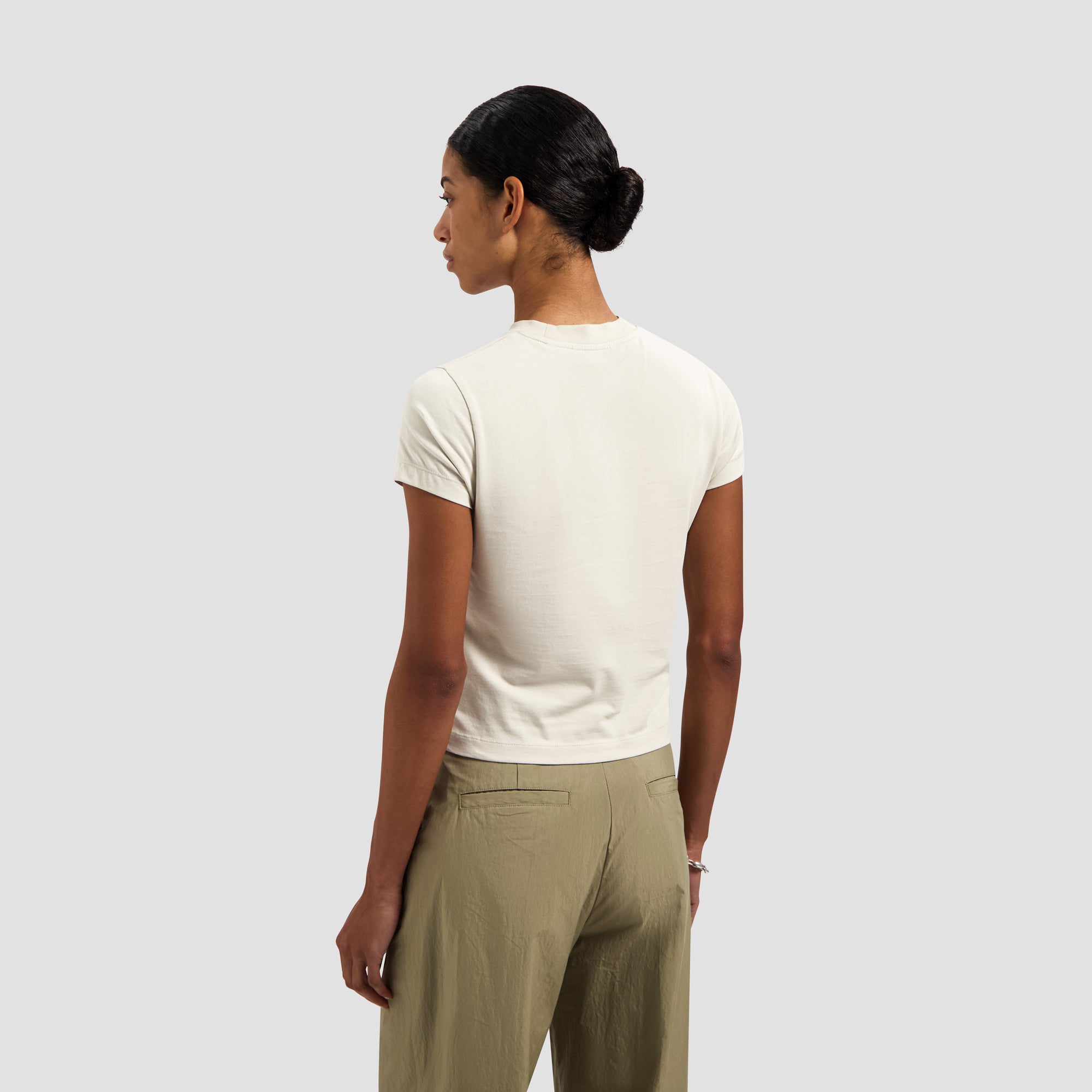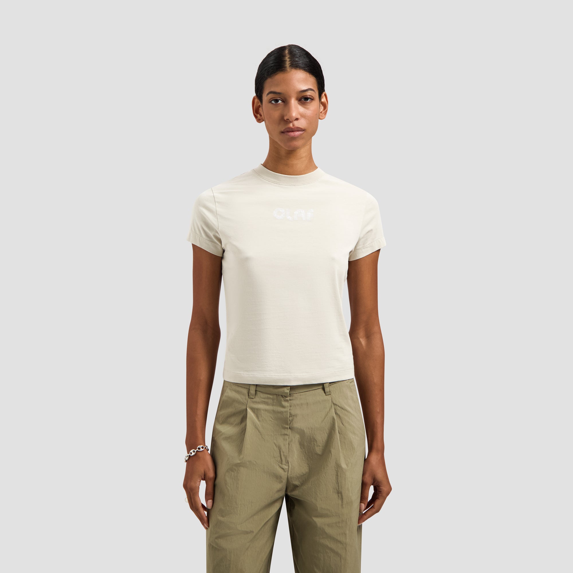 The Olaf Tape Baby Tee in Cement reimagines a fitted baby tee with a taped logo on the front. Made from a soft organic cotton blend with a hint of stretch, it offers a clean and contemporary feel for everyday wear.